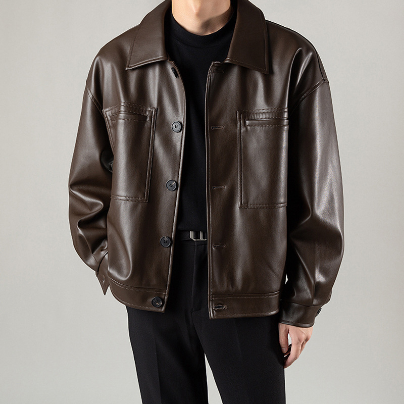 The dark brown leather jacket with its elegant details is the perfect choice to complement your elegance. The buttoned and pocketed design adds both a modern and classic touch, while the high-quality leather material ensures long-lasting wear